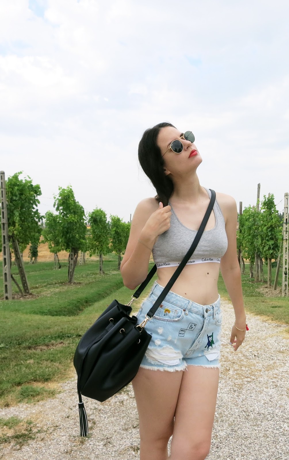 what I am wearing: Rayban Round Classic sunnies / Calvin Klein top / Pull&Bear shorts / JustFab Bucket Bag* / White Madrid Birkenstock